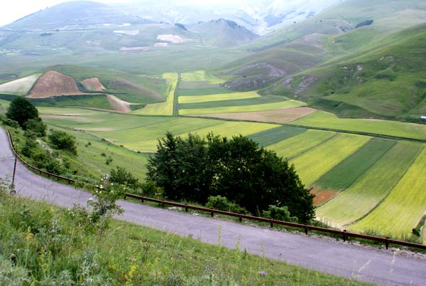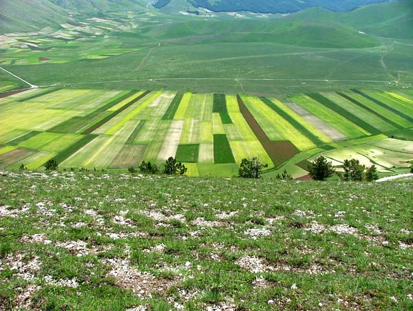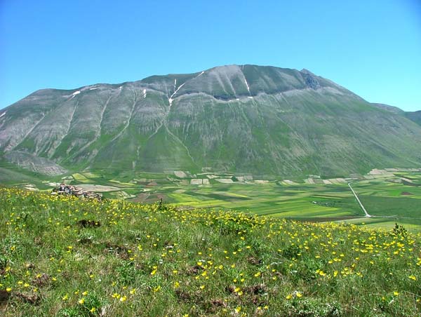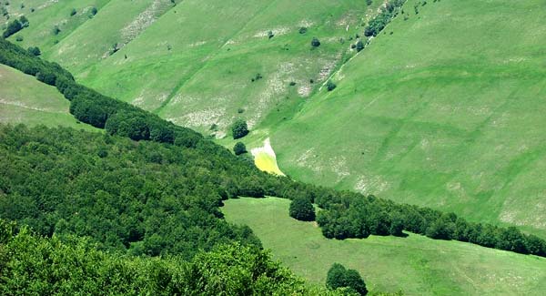 Un mare d’erba e fiori, infatti, lambisce le pendici di montagne verdi come smeraldi e lisce come velluto; una sola strada, niente case, né tralicci, né arbusti, solo radi boschetti di faggi, cerri e carpini formano qua e là delle chiazze più scure sul fianco dei rilievi.